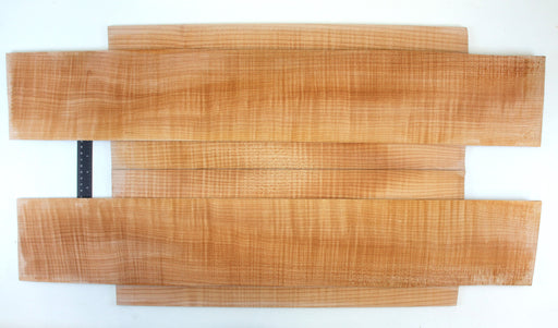 1 Flame Big Leaf Maple (acer macrophyllum) bookmatched set.Back: 56cmx 22.2cm x 5.4mm (22" x 8.7" x .21") each sideSides: 85cm x 14cm x 5.5mm (33.4...